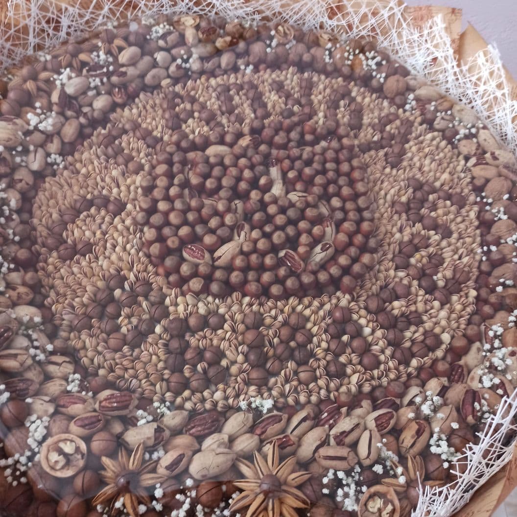 В состав букета входят: грецкий орех, макадамия, фисташка, миндаль, пекан, фундук, цветы гипсофила